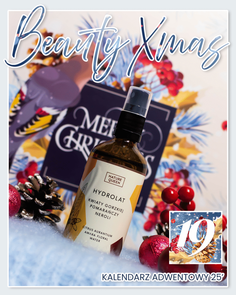 W codziennej pielęgnacji istotne jest nie tylko to, co nakładamy na skórę, ale także sposób, w jaki ją odświeżamy i przygotowujemy na kolejne kroki, dlatego dziś w naszym KALENDARZU ADWENTOWYM BEAUTY XMAS czeka na Ciebie produkt, który ma szansę zyskać status must-have codziennych rytuałów – HYDROLAT Z KWIATÓW GORZKIEJ POMARAŃCZY od marki NATURE QUEEN. Jest on szczególnie ceniony jest za swoją delikatność, łagodzące działanie na skórę, a także za subtelny, kwiatowy aromat, który od razu wprowadza w stan relaksu i dobrego nastroju. Uniwersalny, naturalny i skuteczny – idealny dla każdego typu skóry, poszukującego prostego, ale efektywnego sposobu na poprawę kondycji i odświeżenie cery. Poznajmy go wspólnie bliżej!
